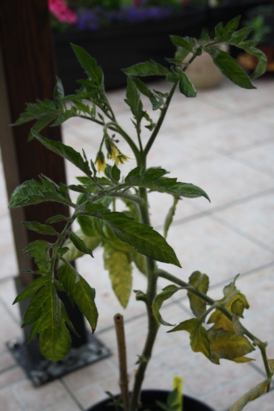 J'ai mis la tomate Sophie's choice dans un grand pot et je remarque que les feuilles se décolorent. Aurais-je eu la main trop lourde sur l'engrais à la plantation ou est-elle atteinte par une maladie ?