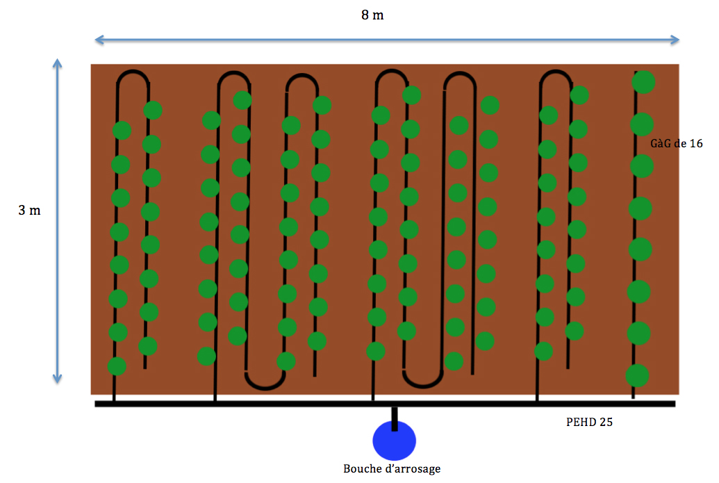 Je sais qu'il est préférable de concevoir un réseau bouclé mais je ne vois pas comment faire au regard de la configuration et de la taille de mon potager.