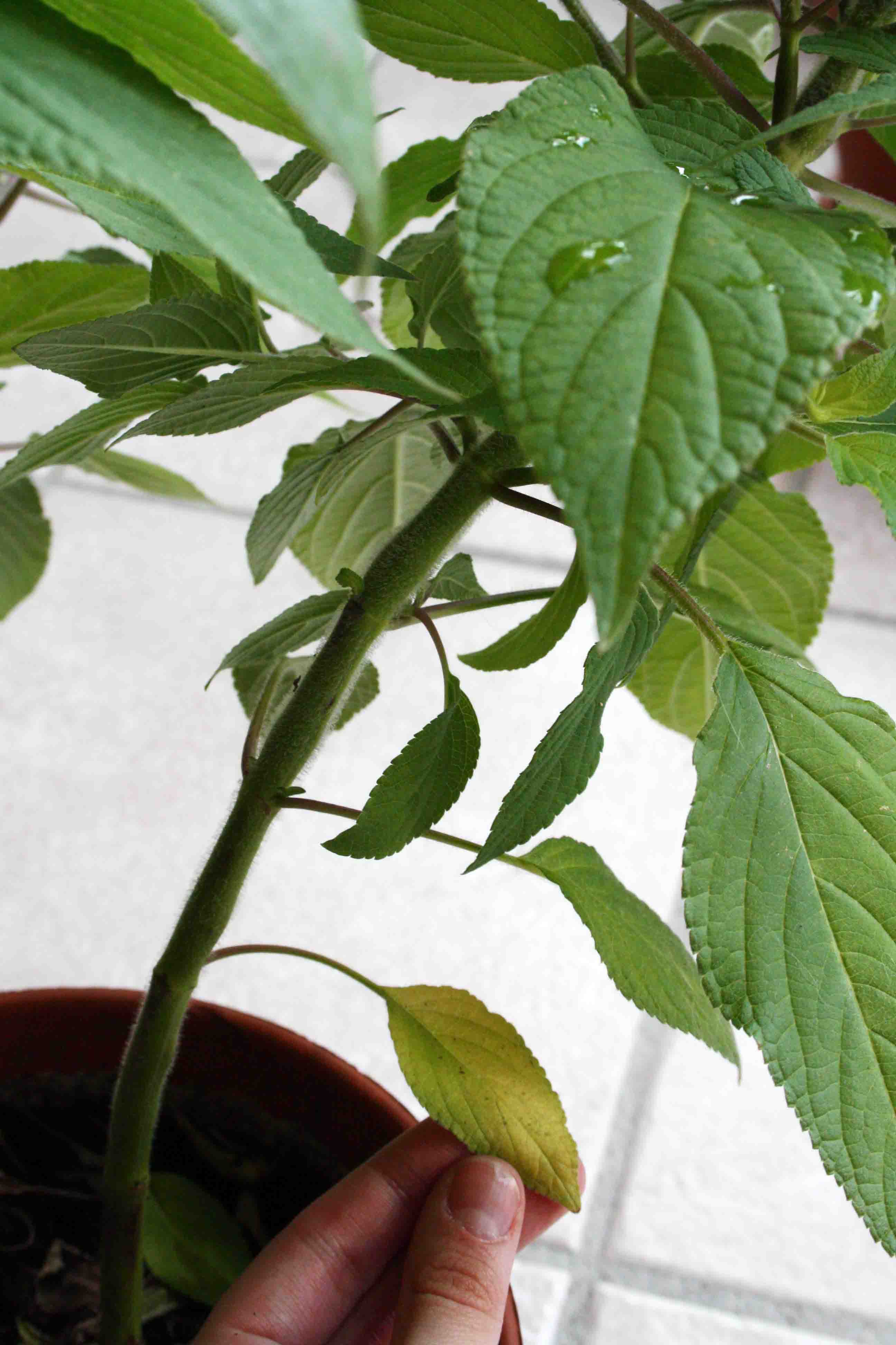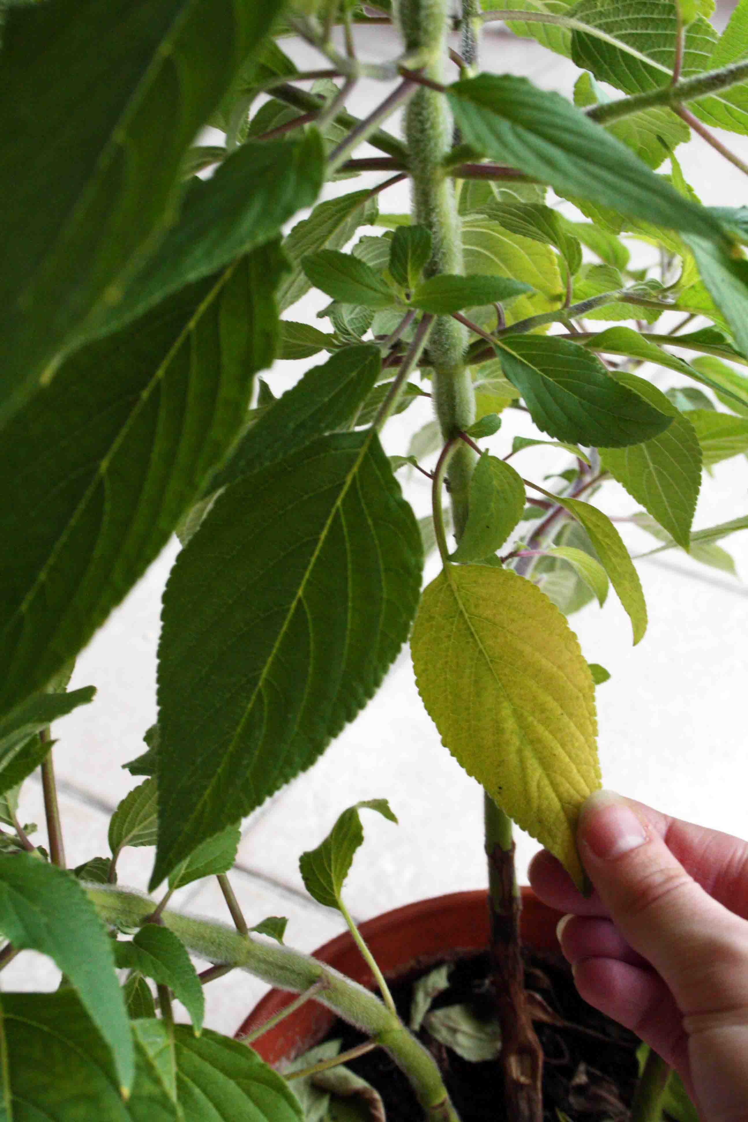 Je vous explique mon problème : j'ai un sauge ananas qui pousse très bien (nouvelles pousses, bonne croissance) mais qui perd ses feuilles à la base (elles jaunissent, puis tombent). Et plus la plante grandit, plus le phénomène remonte le long de la tige. Un peu comme si proportionnellement, le bas de la plante devait toujours être dégarni.