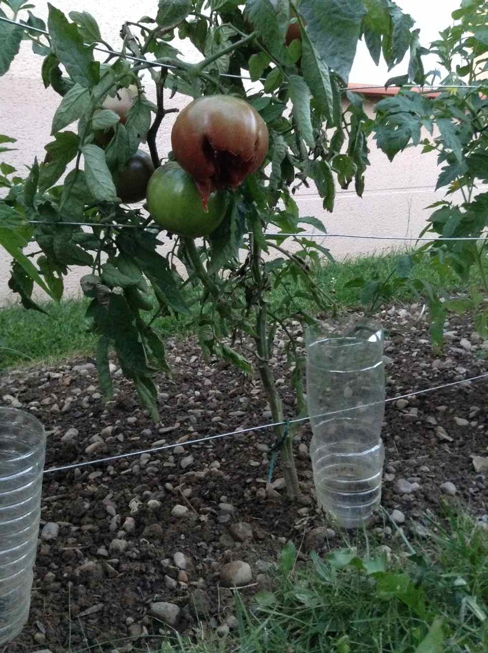 Depuis quelques jours un animal mange les tomates jusqu'à 25-30cm du sol. Il a une préférence pour les noires de Crimée, peut être car elles sont plus lourde donc plus basses...