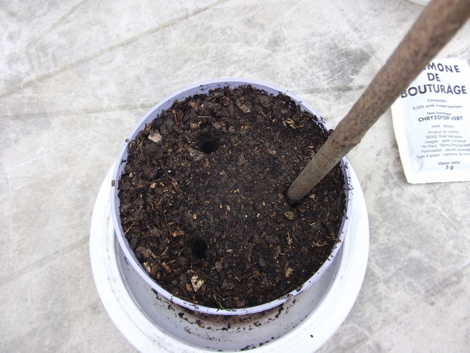 Je "trempe" le bas de la bouture dans un sachet d'hormone de bouturage.(On en trouve dans toutes les jardineries)