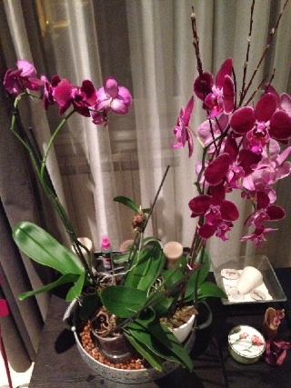 Les deux qui sont fleuries m'ont été offertes il y a un mois. C'est pas moi qui les ai fait refleurir. Je suis arrivée une seule fois à faire refleurir une orchidée, je la sortais la nuit pour le changement de température, et un jour je l'ai oubliée dehors.. En plein soleil.. Ça lui à été fatal.