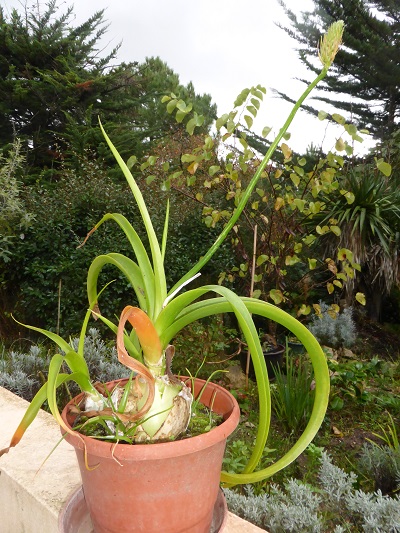 j'ai cette plante qu'un botaniste m'a offerte il y a quelques années. Elle fait de belles et longues feuilles effilées et recourbées et au bout d'une tige il y a une tentative de bouton florale qui échoue en général à fleurir. Sous ses peaux comme celles d'un oignon naissent des bébés en grande quantité.