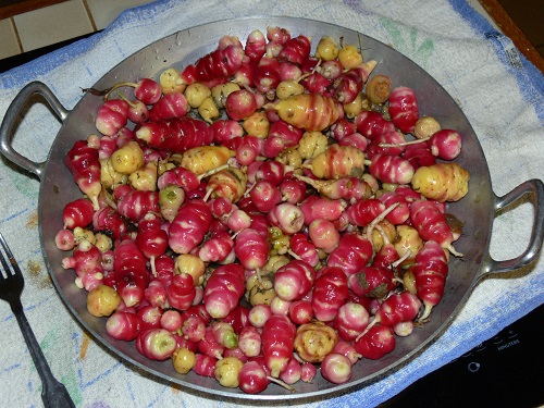 Pour la première fois cette année, j'ai essayé quelques ocas du Pérou (des rouges et des blancs). Ils sont restés 8 jours dans la serre pour perdre en acidité, ont été brossés sous l'eau pour les nettoyer et ont été cuits à l'eau. Ils ont le goût d'une pomme de terre très légèrement acidulée.