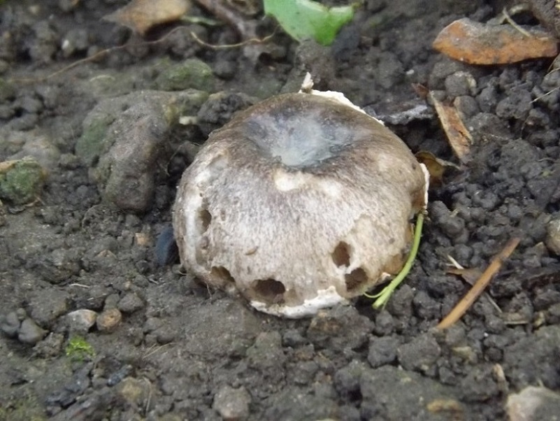 Voilà une photo de plus près avec le pied dégagé .Je ne sais pas si le petit morceau blanc sur son côté droit est un morceau de volve .