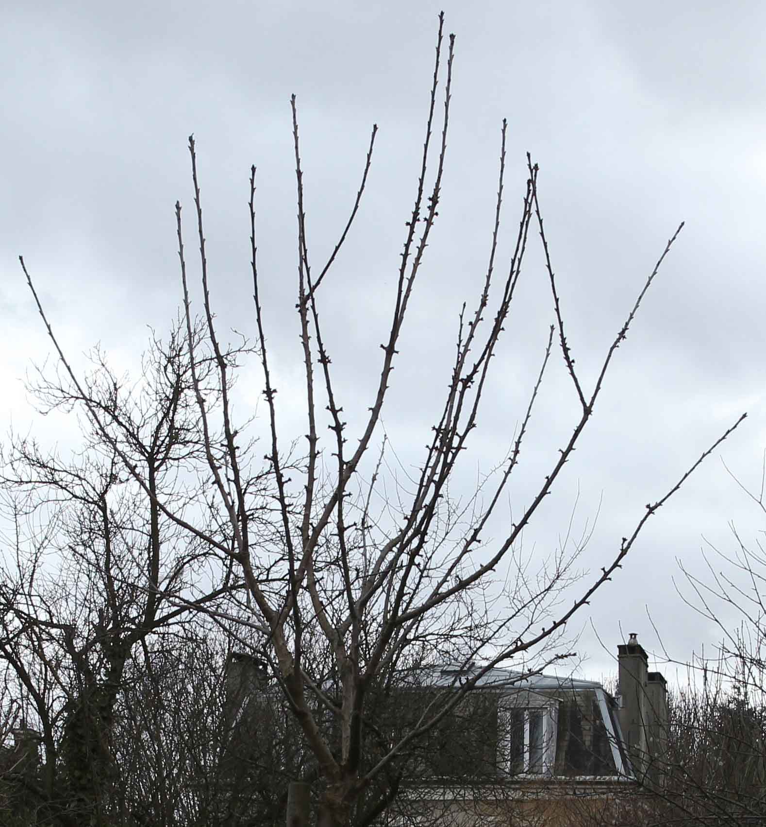 Ce que le Cerisier n'aime pas, c'est que on lui coupe les bourgeons terminaux. Dans le cas de celui-là, les pousses de 2013 sont très longues, il vaut mieux attendre un ou deux ans que les cimes se divisent (elles vont le faire cette année) et que les 'bouquets de mai' continuent à se former (nom des groupes de fleurs).