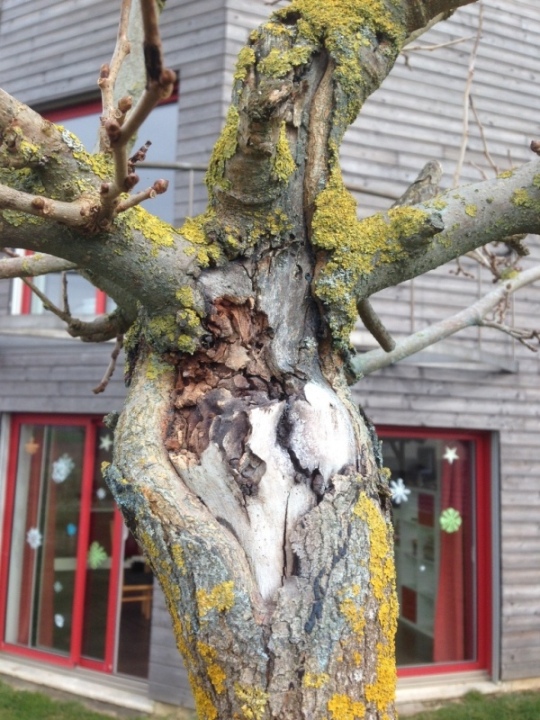 Pulvérisez de la bouillie bordelaise en abondance sur ces Chancres cela ralentira la dégradation du coeur par les bactéries; ou mieux encore de l'oxychlorure de cuivre vendu pour la cloque du pêcher,