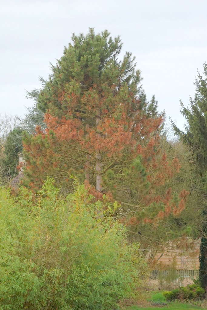 Le causes dépérissement des Pins sont en général les insectes qui vivent dans le bois et les maladies des racines quand il y a trop d'eau dans le sol. On ne voit pas de nids de Processionnaires non plus.