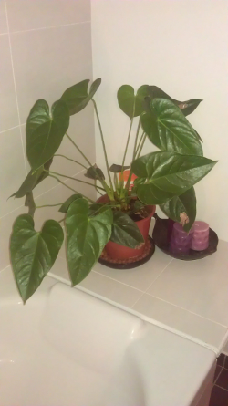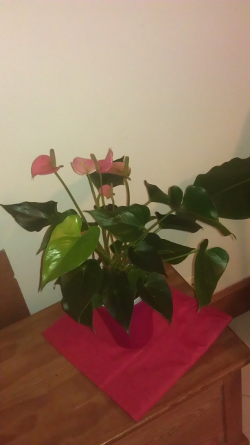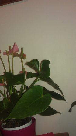 Voilà, j'ai actuellement deux anthuriums : un rose et un rouge. Un troisième devrait les rejoindre une fois qu'il aura défleuri.