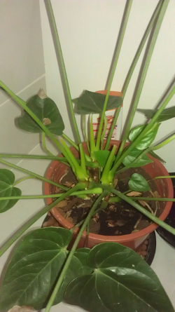 Pour le rouge, il a été rempoté il y a 1-2 semaines et il a des "tubes". D'après mon expérience passée, ça serait des feuilles en devenir. Si c'est le cas, tant mieux car il est "dégarni" au centre.