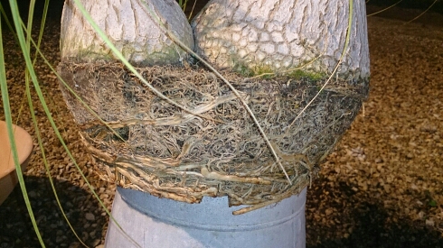 (le pot en plastique était complètement déformé, en pression sur les caudex, les racines ressortaient par en dessous... une fois dépoté, les racines ont gardé la structure interne du pot)