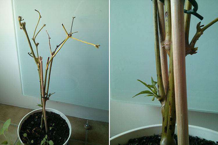 L'hiver passe petit à petit et je m'aperçois que les tiges restent vivantes. Il y a quelques jours, surprise : des feuilles apparaissent !