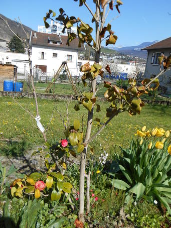 La branche principale porte de nombreux bourgeons qui ne semblent pas avoir envie d'éclore alors qu'une branche qui part sur le coté a quelques fleurs.