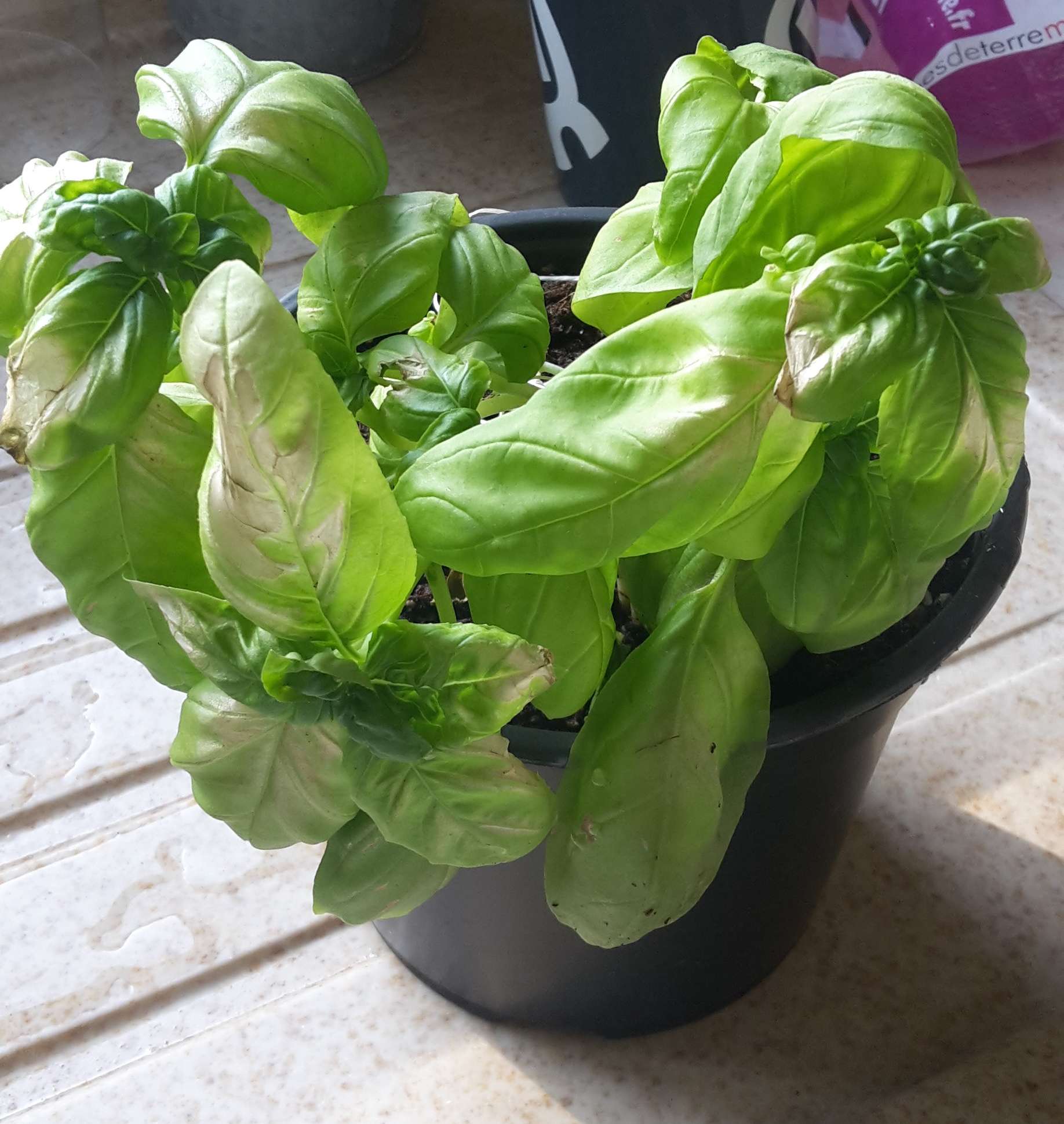 Il y a quelques semaines j'ai acheté un petit basilic. Au départ, je l'avais mis dans ma cuisine, sur un étagère qui est ensoleillée l'après-midi. Par moments, ses branches étaient molles. Je l'ai changé de place pour le mettre sur le rebord de la fenêtre. Je l'ai laissé 2 jours et je l'ai rapidement enlevé quand je me suis aperçue que certaines des feuilles étaient devenues dorées/transparentes (comme sur la photo).