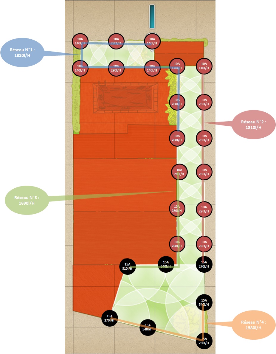 Effectivement, avec la tuyère de plus, cela me semble mieux (cf le nouveau plan en pièce jointe). En revanche, est-ce "grave" d'avoir des zones qui ne sont arrosées que par un seul arroseur ? Il y en a 3 sur la partie du bas et 2 petites au dessus de la nouvelle tuyère (il s'agit des zones en vert un peu plus foncées que les autres).