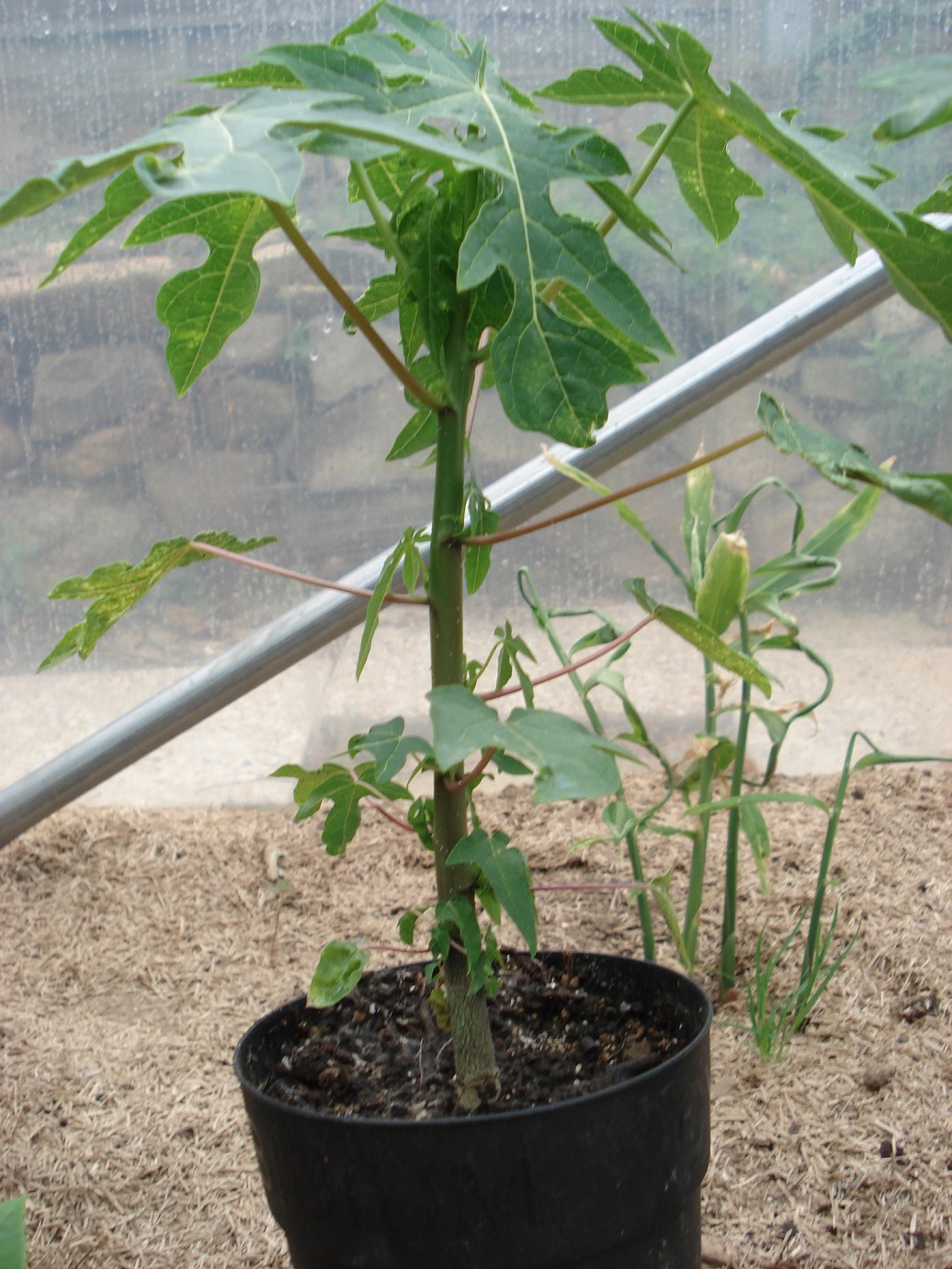 voici deux plants de papayer semés en mai dernier le même jour dans les mêmes conditions. L'un a été placé dans la véranda (max 32°C), l'autre dans la serre(max 54°C)...Le papayer solo reçu début juillet, mis en pleine terre dans la serre est passé de 60 cm à 80...