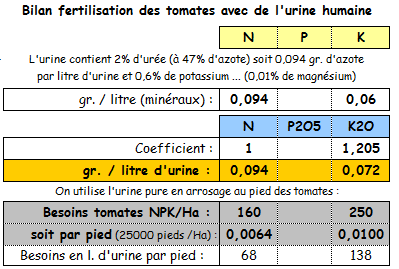 Avec 1 litre d'urine par pied de tomates, on couvrirait les besoins en azote de la plante. Il faudra couvrir les besoins en P et K.