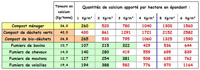 Ci-dessous, ce qu'on apporte en calcium par hectare suivant les produits organiques du tableau ci-dessus et les quantités épandues (j'ai mis en rouge les apports qui dépassent 400 Kg de calcium par hectare)