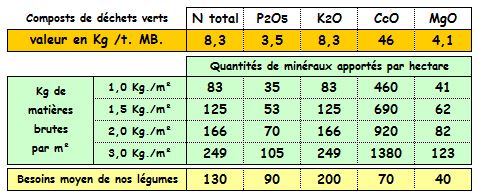 La couverture des planches du potager avec du compost de déchets verts est très indiquée. Il serait alors utilisé en couverture, sans l'enfouir, pour éviter le "sol nu". Son apport important de calcium donné par le résultat moyen de 45 sites avec 7,8 gr. de CaO sur la MS (et 59% de MS) soit 43 Kg de CaO / tonne brute et son pH à 8,4, ne peuvent qu'aider à améliorer la structure de ces sols, au fil du temps.