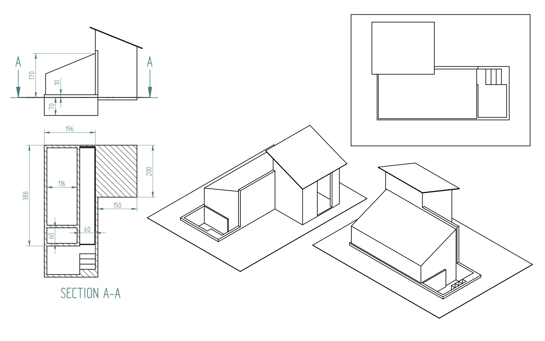 le dessin reste très schématique. Je n'ai ni détaillé la charpente de la cabane, ni les goutières ni le système de filet anti grêle (qui reste a peaufiner) ni les aérations.