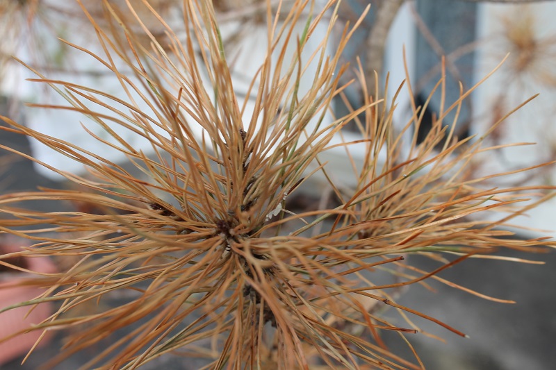 Bref, depuis deux semaines environ, les aiguilles de l'un des deux brunissent. Je l'ai remarqué au début, ça ne touchait que quelques amas d'aiguilles par ci par là. Mais maintenant, tout l'arbre est touché. J'ai cherché sur internet, j'ai trouvé une maladie du pin (vraisemblablement originaire des USA) avec des aiguilles qui brunissent également mais les symptômes ne correspondent pas.