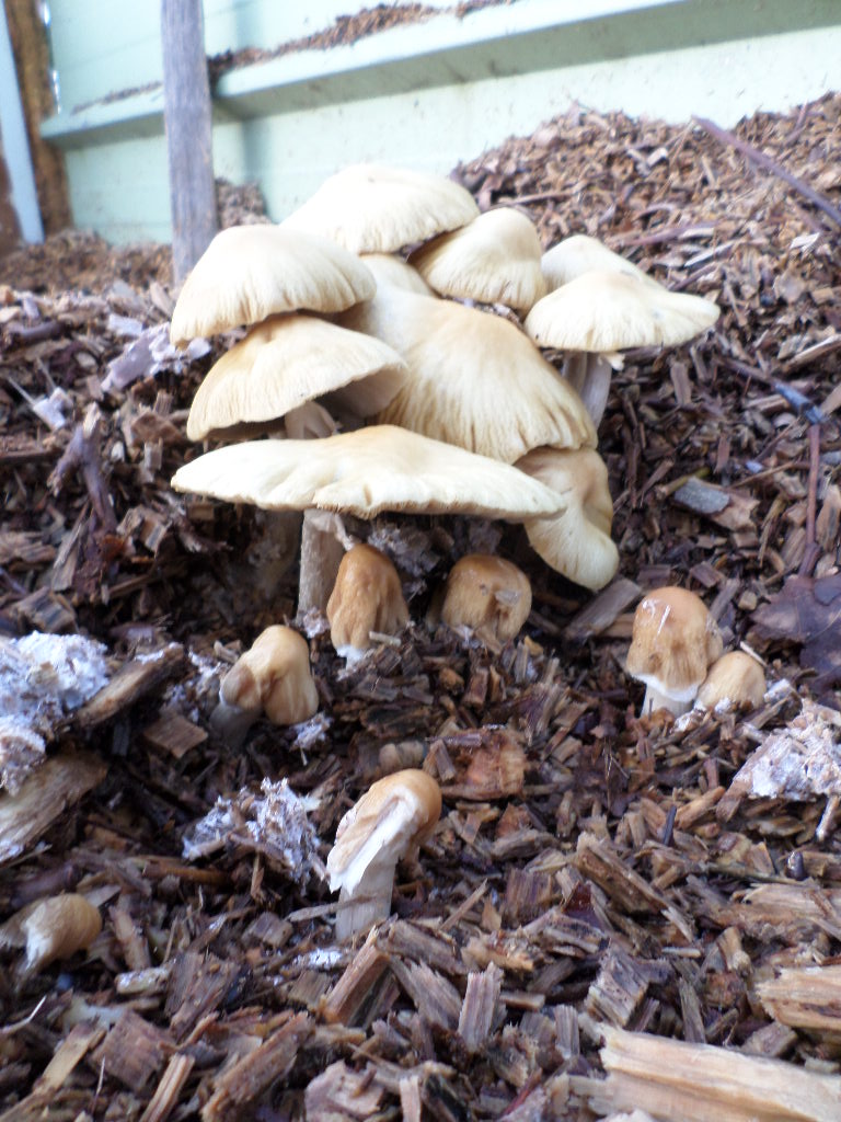 Bonjour, aujourd'hui j'ai eu une surprise, une touffe de champignons a pousser sur le tas de brf.