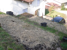 Je te conseille de mettre des bordurettes et de pailler entre les bordurettes. Par dessus la paille tu peux jeter des branchettes ou des tuiles pour tenir la paille.