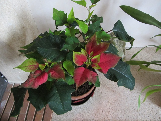 La même voisine m'avait déjà offert un poinsettia il y a deux ans. Je ne l'avais pas taillé, il était resté beau l'année suivante, mais je crois qu'il avait plutôt l'aspect d'une plante verte et plus tellement de feuilles rouges, puis au printemps de l'année suivante, j'ai voulu le tailler, et j'ai trouvé qu'il avait perdu tout son sex appeal. Pendant l'été, donc 2015, je l'ai sorti et mis sous un sapin, mais le soleil a réussi à passer à travers les branches du sapin, et le poinsettia a grillé et rendu l'âme.
