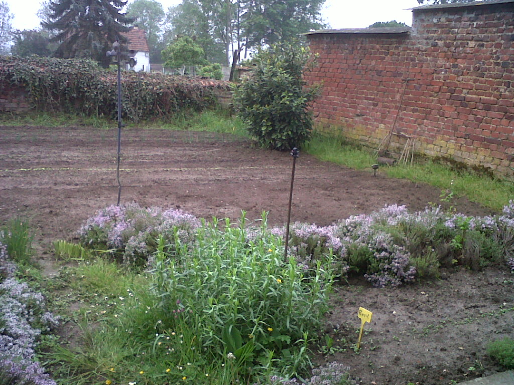 ce jardin ne fait qu'une vingtaines de mètres carré seulement pour les aromates et les pépinières et quelque fleur de printemps .