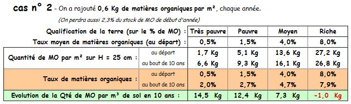 Surlignée de jaune, on a la quantité de MO à rajouter chaque année. Voyez le résultat des courses ... au bout de 10 ans !