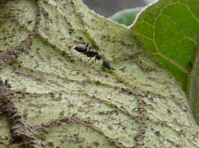 Cherchez bien sous les feuilles : cette fourmi ne fait pas 2 millimètres et le puceron devant mesure donc à peine 1/2 millimètre