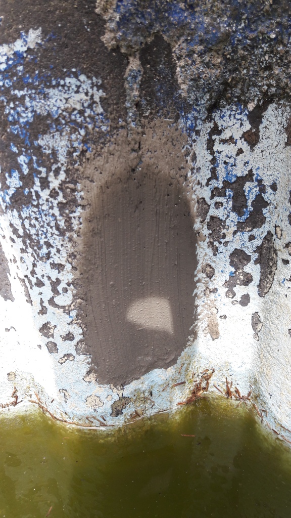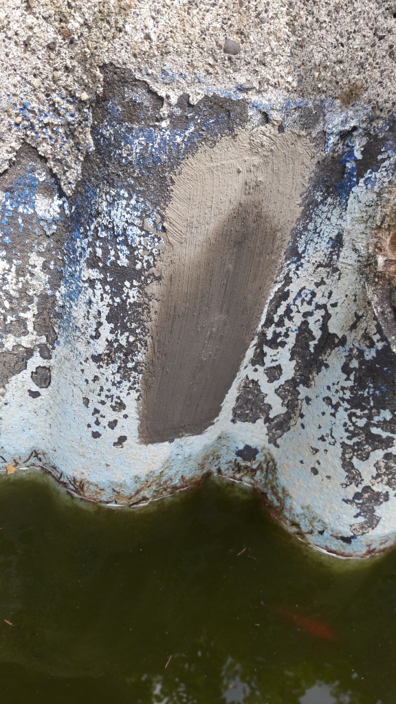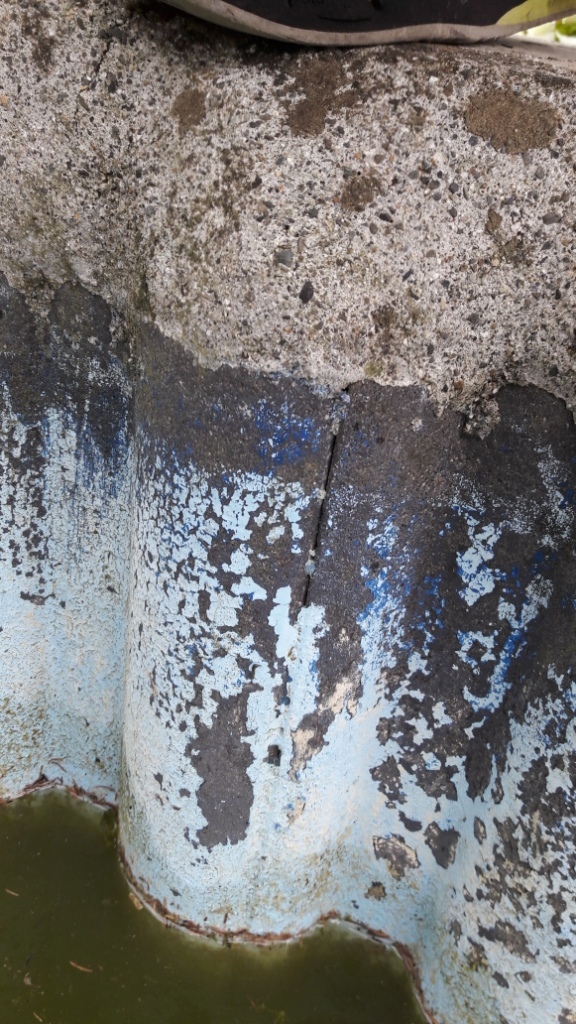 Donc j'ai vidé un peu plus mon bassin manière d'arriver en dessous du niveau d'eau où il se stabilisait et j'ai nettoyé les parois au karcher et là surprise >>>> des fissures!