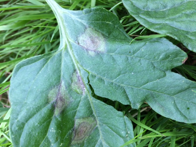 Si on regarde l'aspect général de la feuille, ça ressemble au mildiou avec la décoloration vert pâle autour de la tâche , mais la forme des tâches n'y est pas