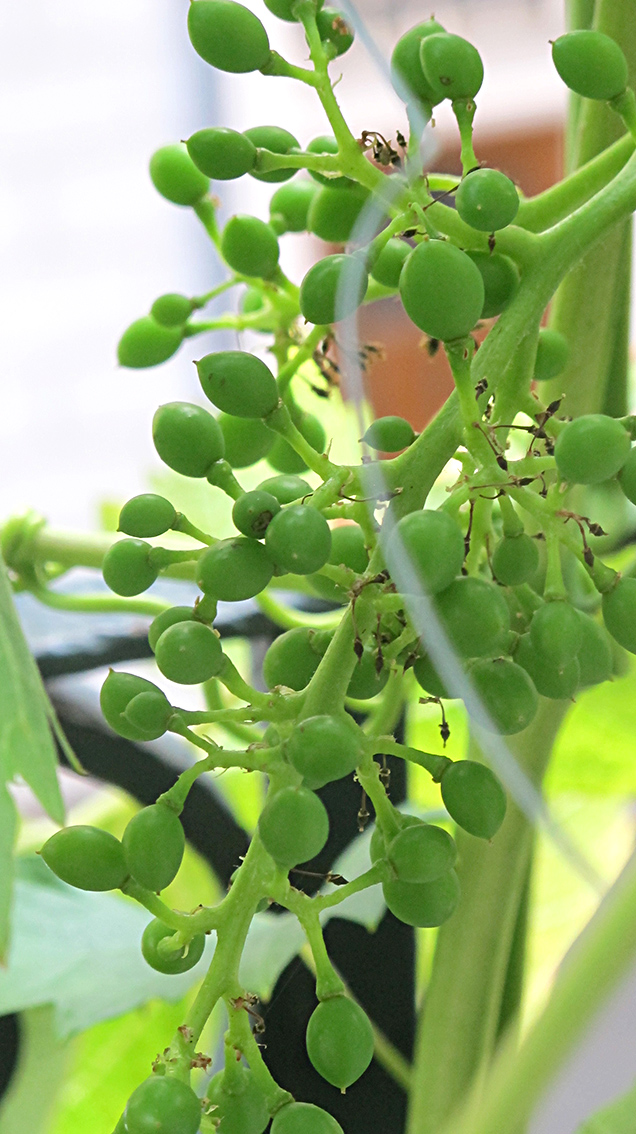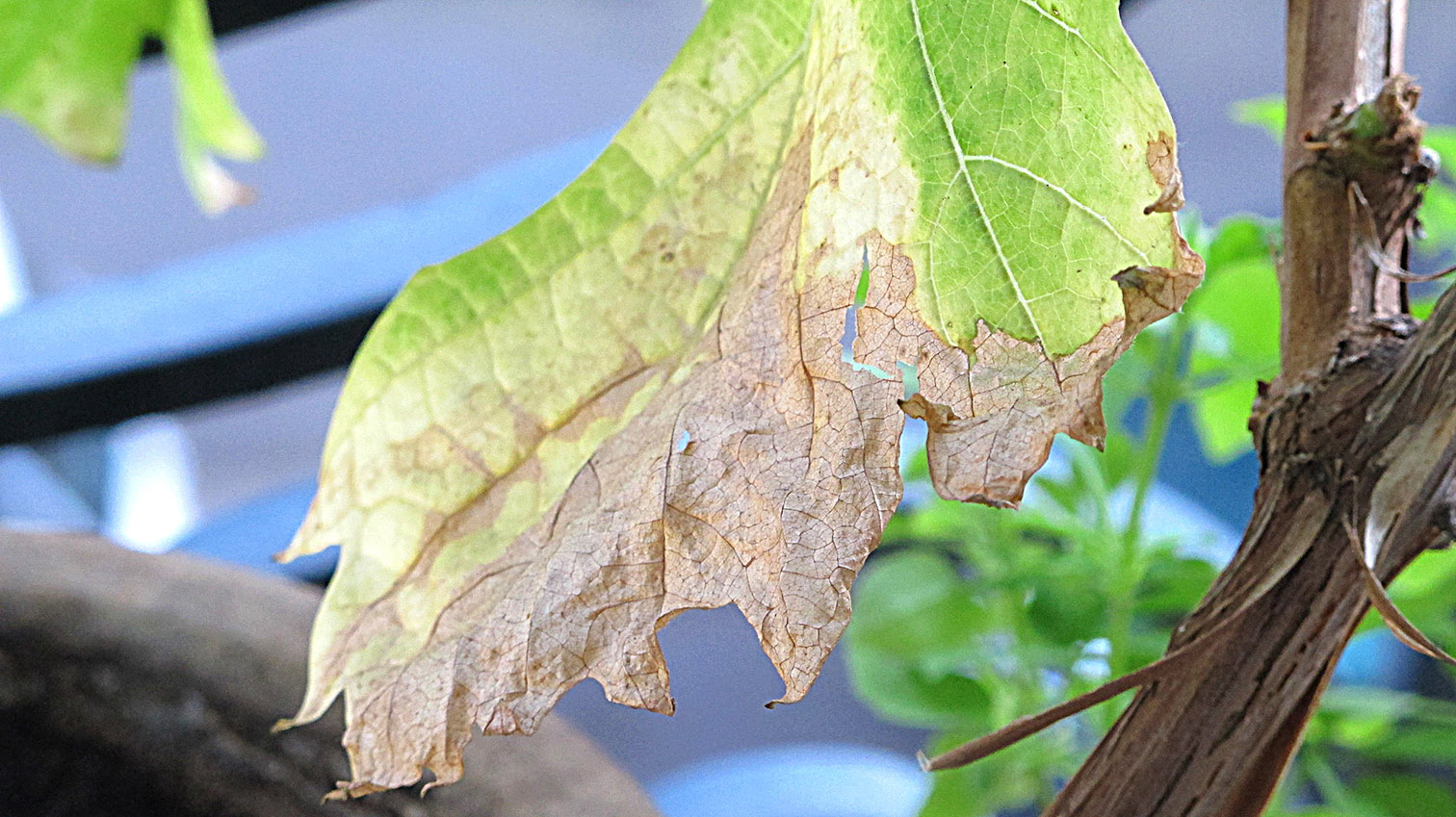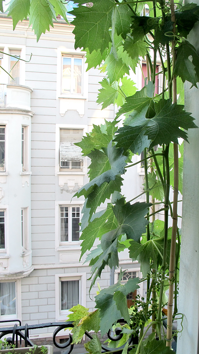 Autre chose : la vigne fait près de trois mètres maintenant, et commence à redescendre de l'autre côté de la porte-fenêtre. Je pensais la rabattre à deux mètres (un peu plus haut que le treillage qui la soutient, donc), mais si elle perd ses feuilles, est-ce que c'est bien intelligent de gêner la pousse des feuilles restantes et donc la photosynthèse ?