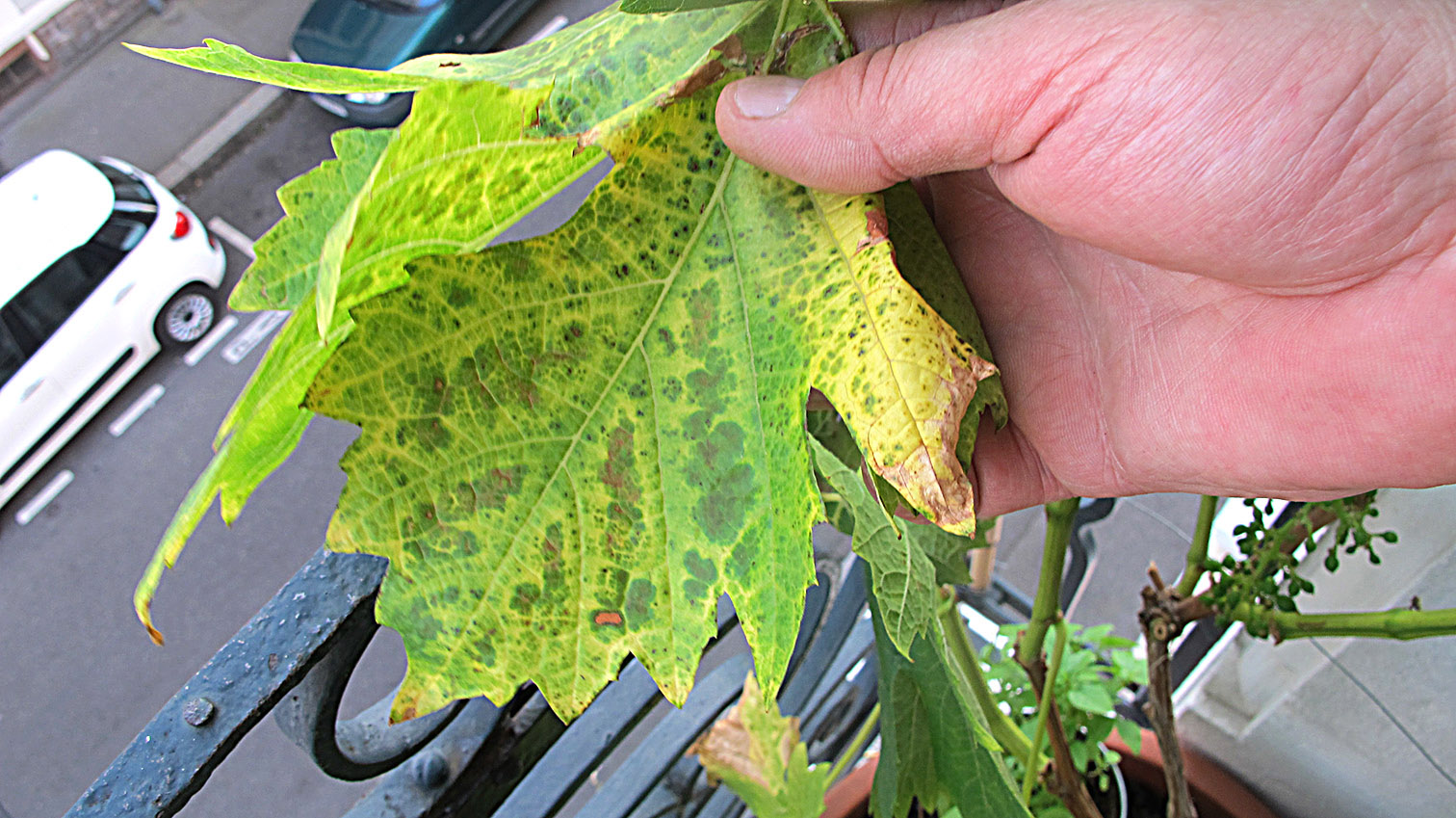 Merci xycoco ! En fait, après la coupe des feuilles du bas, la vigne semble aller mieux et puis les deux grappes grossissent et embellissent : on verra bien.