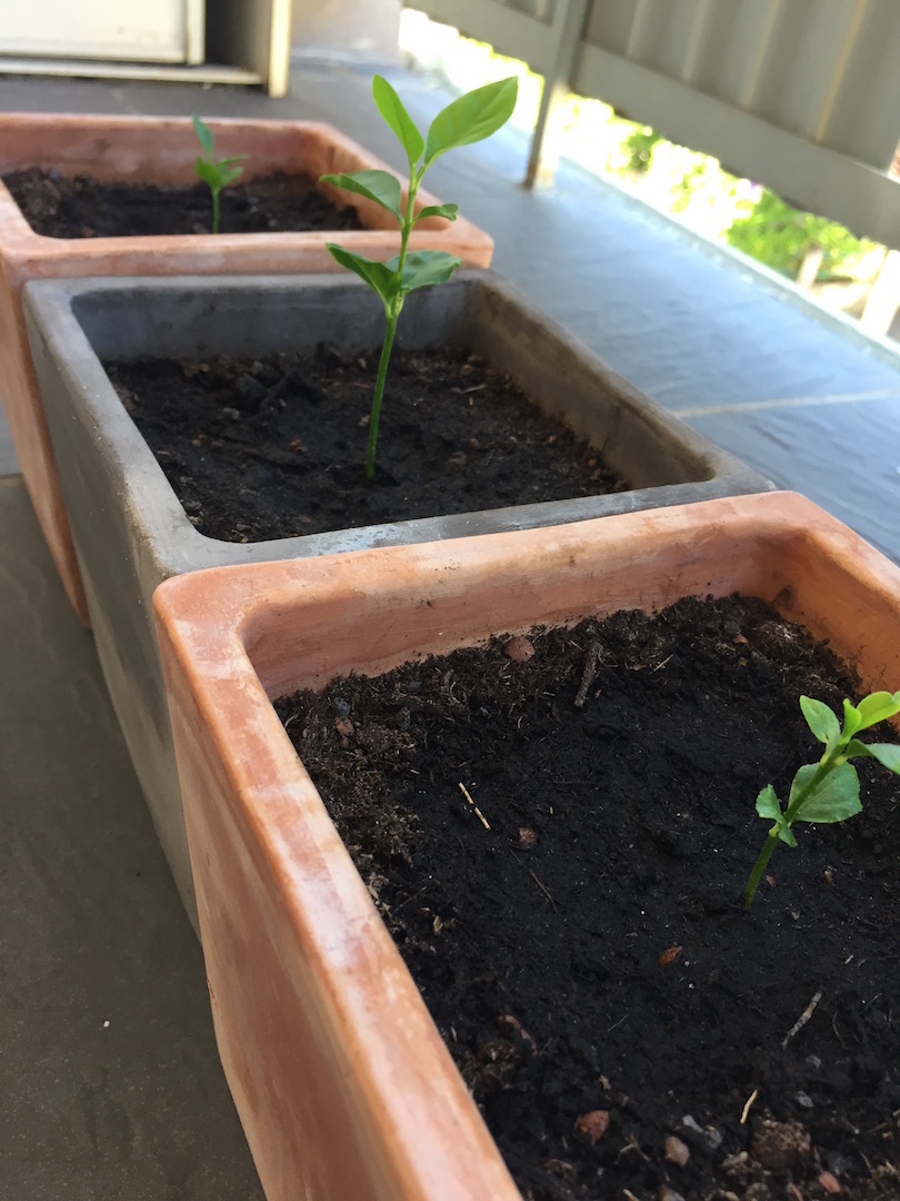 A force de flanquer, au passage, des pépins de citrons et autres agrumes dans les jardinières, je me suis retrouvée avec une dizaine plants, dont certains font à présent un mètre et plus de haut. Les agrumes peuvent être très résistants, du moment que le gel leur est épargné.