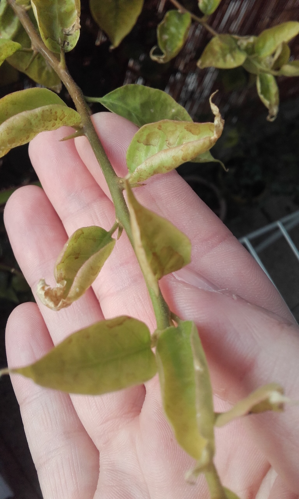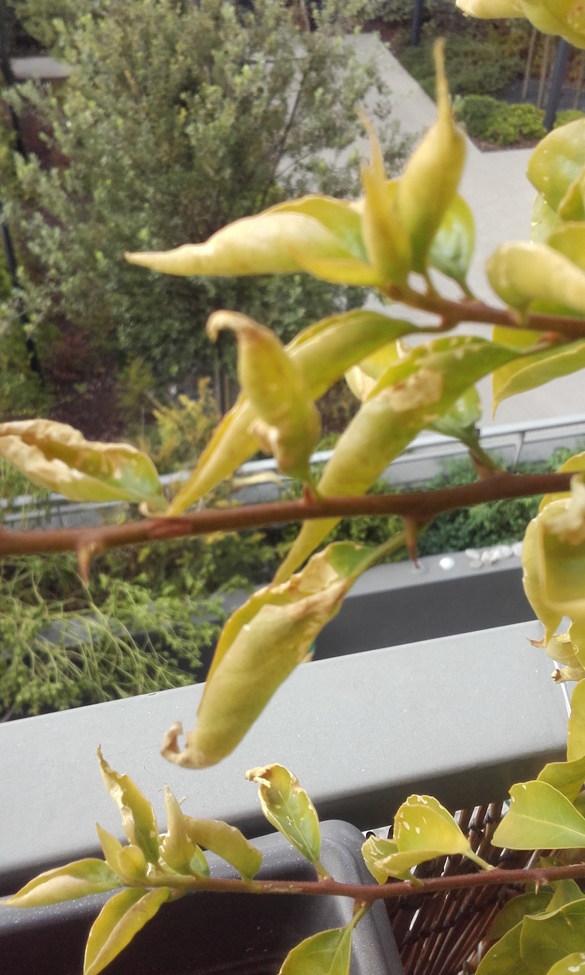 Les nouvelles feuilles sont recroquevillées et tachetées aussi. Je n'ai trouvé ni cochenille ni araignée à l'oeil nu.