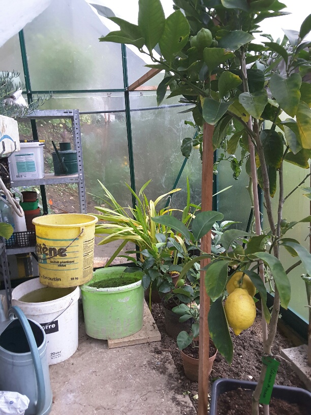 Ce citronier de pezenas est très vigoureux et le sujet que j'ai acheté me donne sa deuxième recolte de citrons: six, la première année et plus d'une vingtaine maintenant. Depuis une semaine, tous mes agrumes sont en serre froide, la fructification continue....