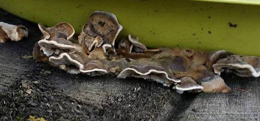 Voici une photo de la "meringue" prise ce matin (pot jaune) et une autre sur un bouleau coupé (pot brique) où il y a les fameuses tramètes.