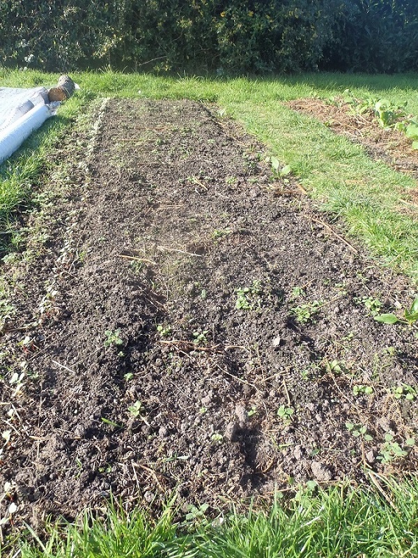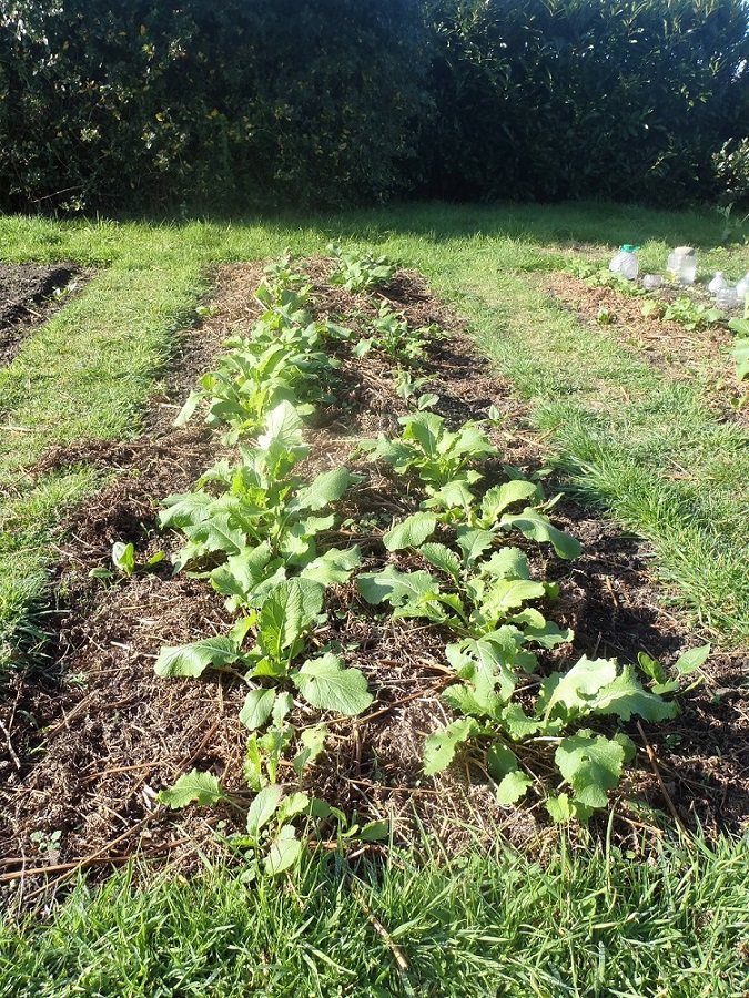 On commence par la planche loupée, où il y aurait du avoir de la mâche et des épinards...quasiment rien n'a levé. Après avoir fait un semis sous paillage, j'en ai refait un sans le paillage...pas plus de résultat. Tout à gauche, un rang de radis en train de lever, qui remplacera celui que je viens de manger : Ici, des navets au centre, et il y aurait du y avoir des épinards aussi sur les côtés... Ici, des salades à droite qui poussent à l'abri de leurs "mini-serres", avec 1 rang de radis qui vient de lever au milieu; 1 rang de radis noirs au centre...et des épinards à gauche. Ici, 2 rangs de carottes à gauche (j'ai lu entre-temps qu'il fallait éviter de mettre 2 rangs côté à côte, on verra bien le résultat), 2 rangs de pois ronds à droite, et 1 demi rang de mâche plantée (10 plants offerts par une amie). Et une vue d'ensemble, au 1er plan un rang ouvert tardivement et semé sous voile le 13/10, un peu de tout (radis, radis noirs, navets, carottes). A part le rang sous voile, n'ayant pas pu les faire avant j'ai semé tous les autres rangs entre le 11 et le 13/09...on verra donc ce qui arrivera à maturité étant donné que l'hiver approche à grand pas !
