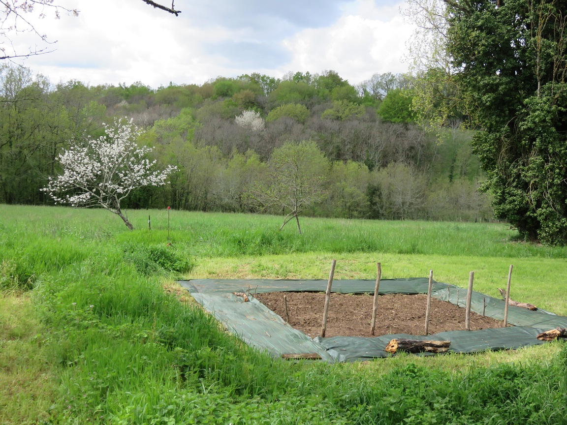 Ces trois gros peupliers sont probablement centenaires, voire plus. Enfin les deux qui restent, car du troisième, on ne voit plus que la souche, et les nouveaux rejets. Ils pompent pas mal d’eau et font un peu d’ombre, mais en été, vu le climat de plus en plus sec et caniculaire qu’on a en Périgord, l’ombre est plutôt bienvenue. En tout cas, je ne vais pas les abattre, ils m’accompagnent depuis 53 ans, et je respecte leur grand âge. Par ailleurs, plus prosaïquement, quand l’autre s’est abattu sous un orage, on en a bavé pour dégager les prés et on a fait 25 stères de mauvais bois, plus 1000€ dans la poche du bûcheron local, donc j’espère bien ne pas recommencer de sitôt. Mon mini potager d’il y a deux ans, bêché à la main et dans le chiendent. Je m’en souviens encore !