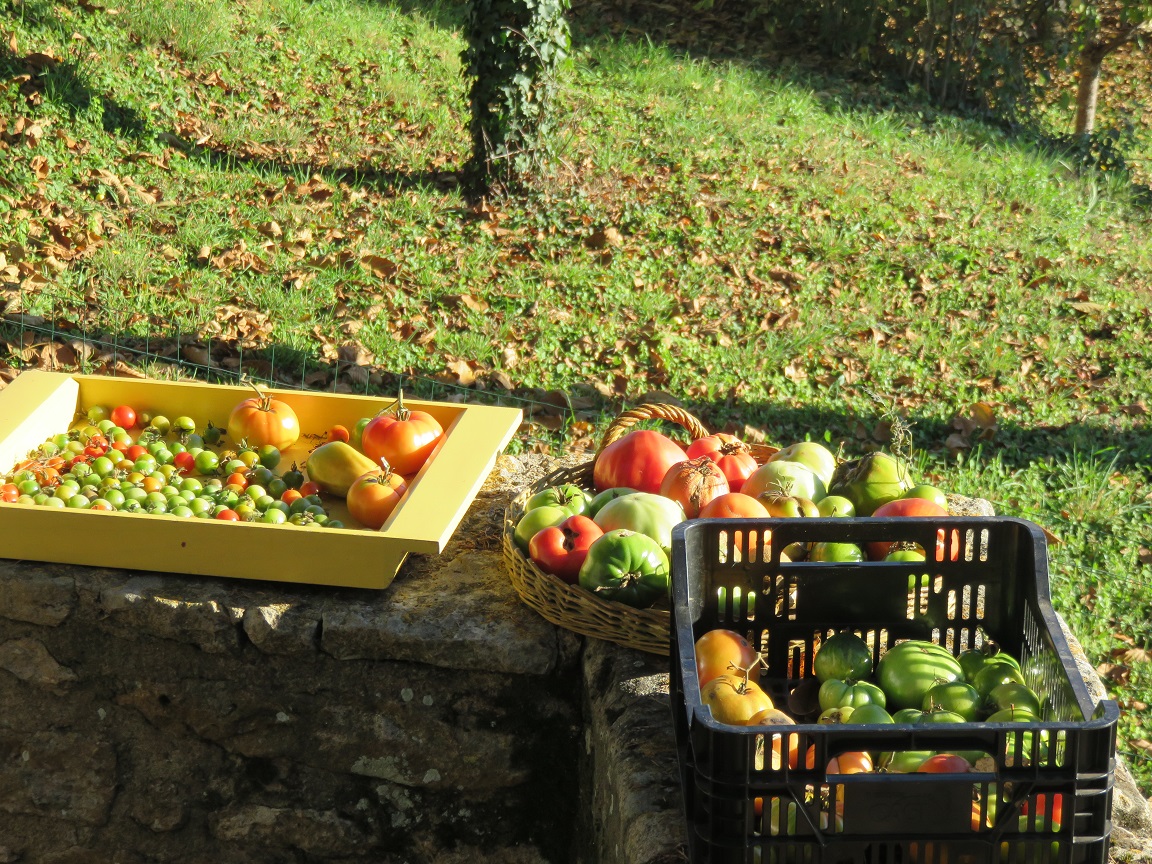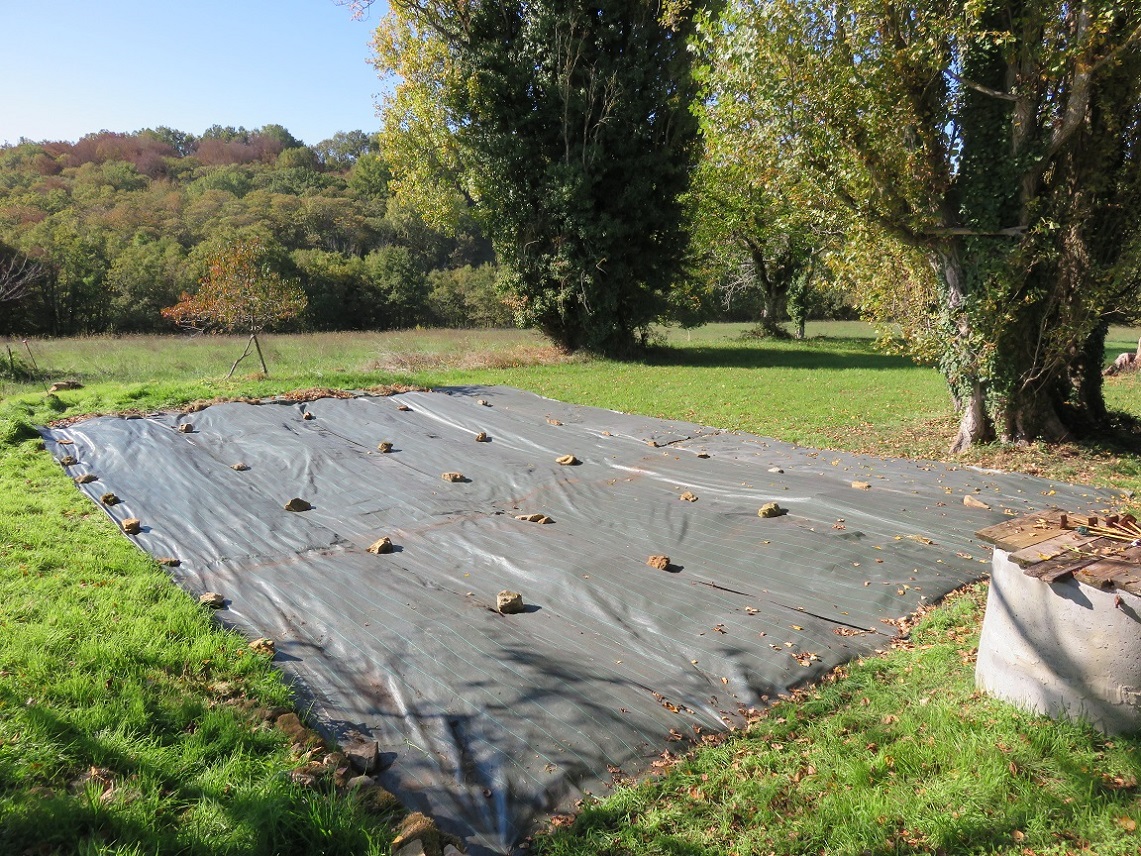 Mais quand même de petites récoltes bien agréables. Ici ce sont les dernières tomates récoltées à la Toussaint. Après ma conversion au jardinage sans travail du sol, voici l’extension commencée cet automne. Quatre planches de 1,30m par 12m, séparées par des allées de 60cm bâchées . BRF + foin + feuilles mortes + cendres de bois.On voit le puits dans le fond. Ensuite, nous avons tout recouvert de bâches de paillage par sécurité, car n’étant pas souvent là, je fais confiance à la prairie pour recoloniser mes paillis en fin d’hiver ! Incroyable la puissance de vie de cette prairie au printemps ! Je ne serai de retour dans mon paradis qu’en avril. D’ici là restent des semis à faire au chaud, que j’installerai pendant le pont de l’ascension…