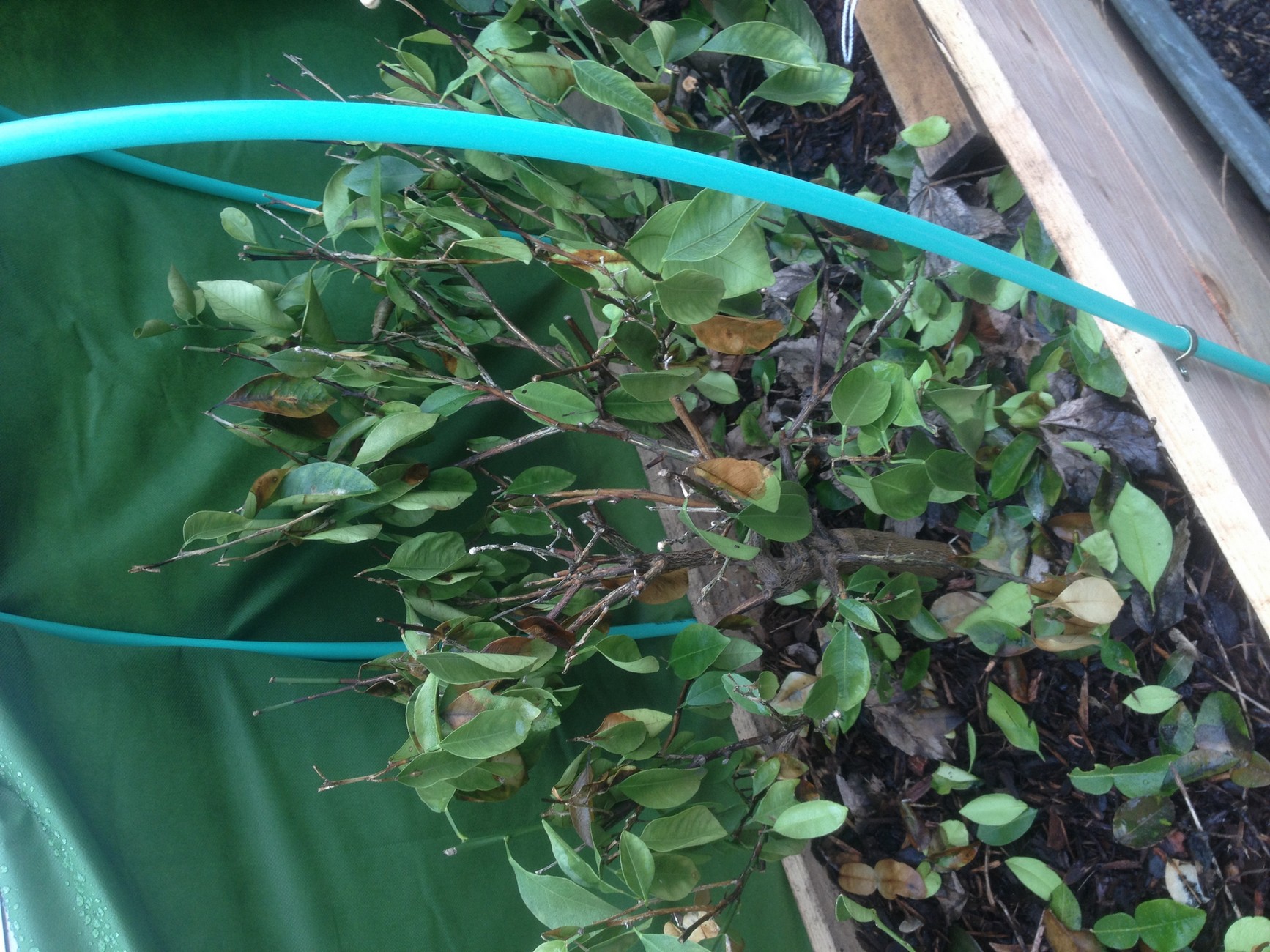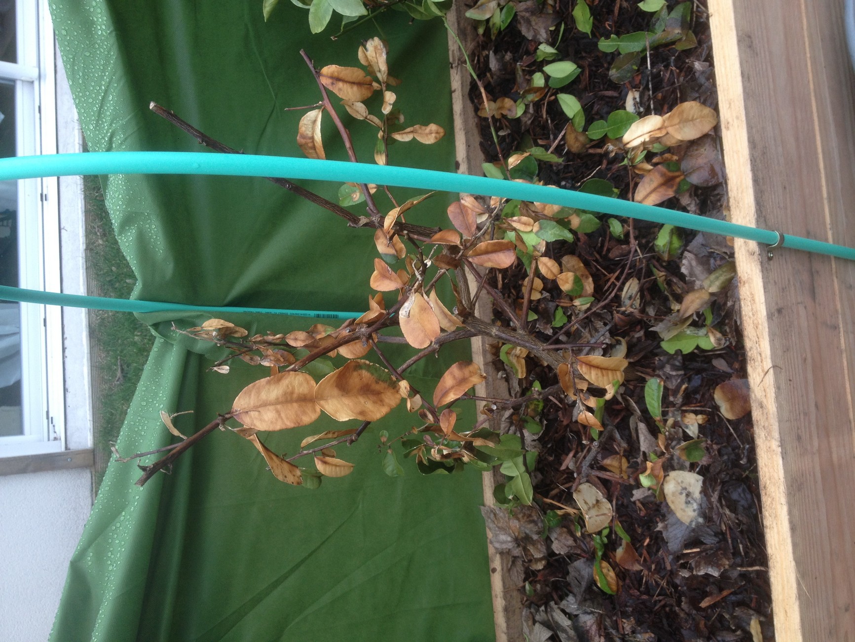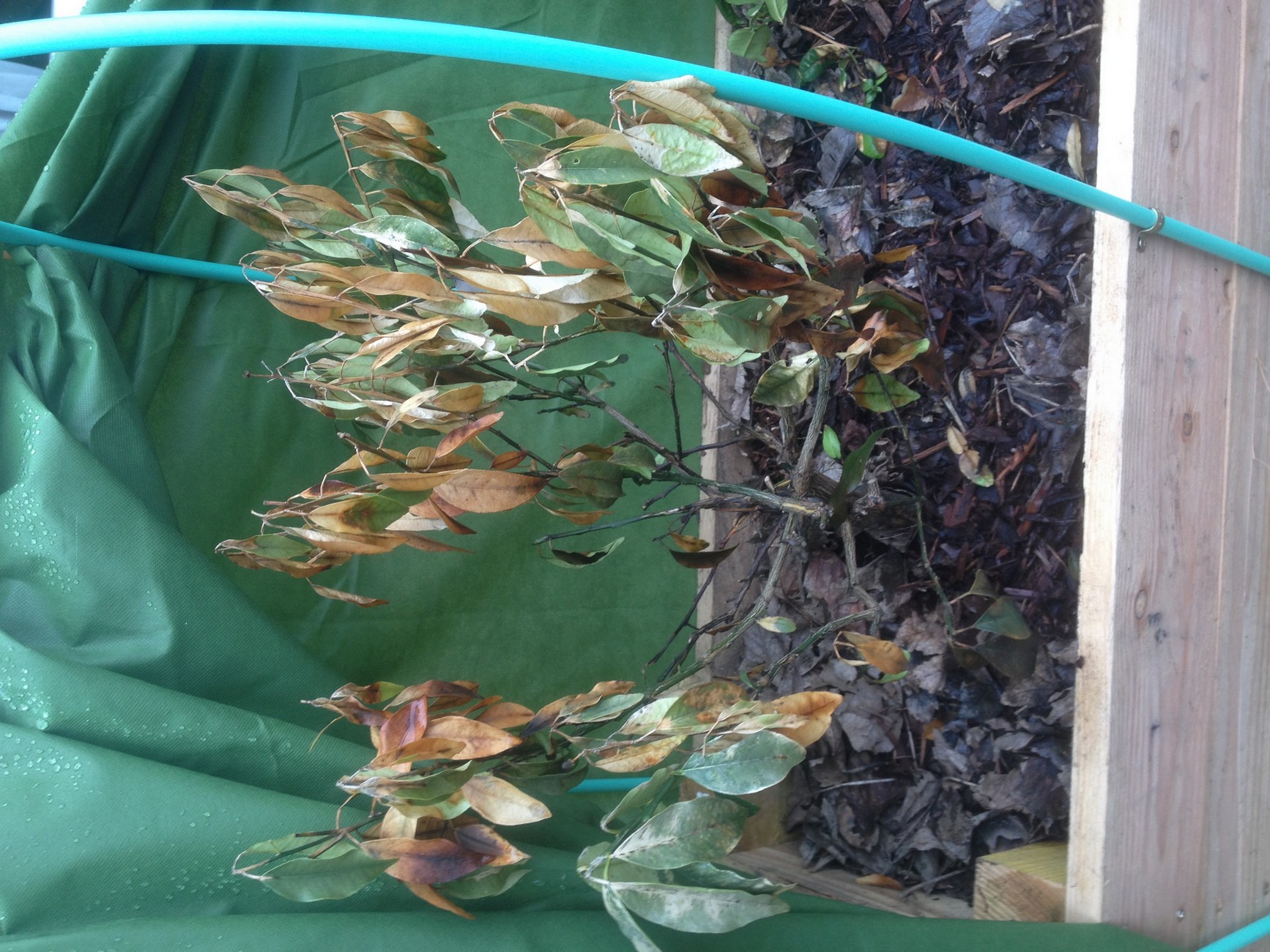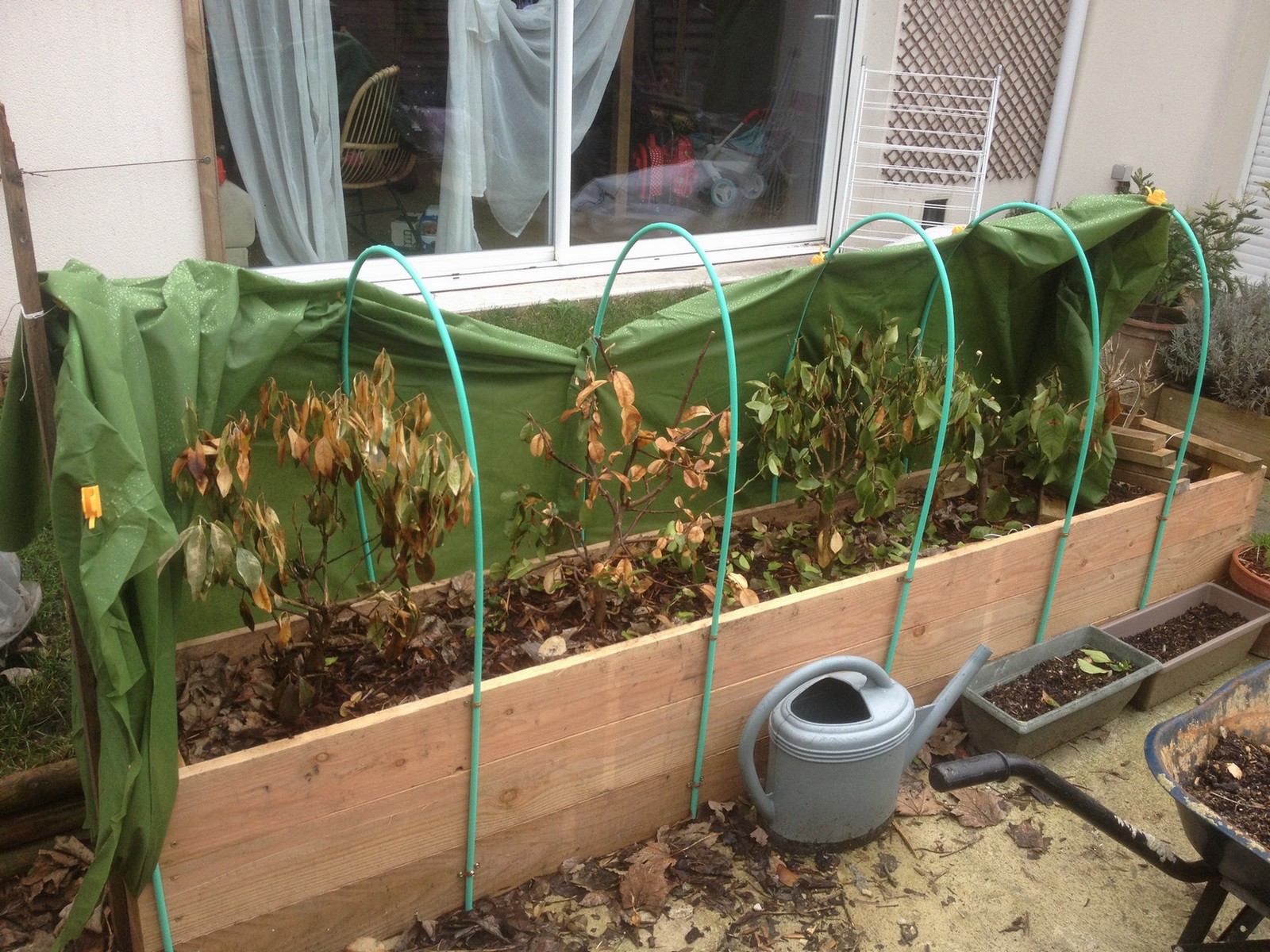 à la fin de l'automne ,j'ai fabriqué un bac en bois dans lequel j'ai plaçé mes agrumes ( citronnier ,oranger ,conbonwa et kumkuat en pot ,puis j' ai rempli de feuilles mortes pour protéger les pots du gel. ensuite j'ai installé un voile d'hivernage sur des arceaux ( voir photo jointe) .