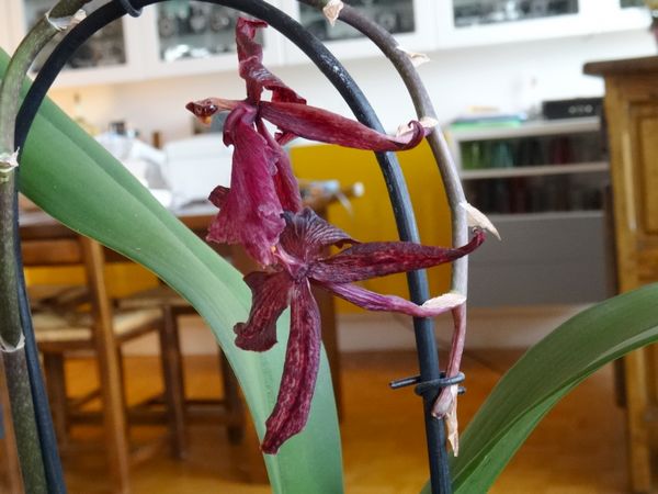 Tu l'as reçue en fleurs il y a 15 jours, mais il faut compter aussi quelques jours de floraison avant l'achat ; il ne faut hélas pas compter sur une durée très longue de floraison, comparée aux phalaenopsis par exemple.