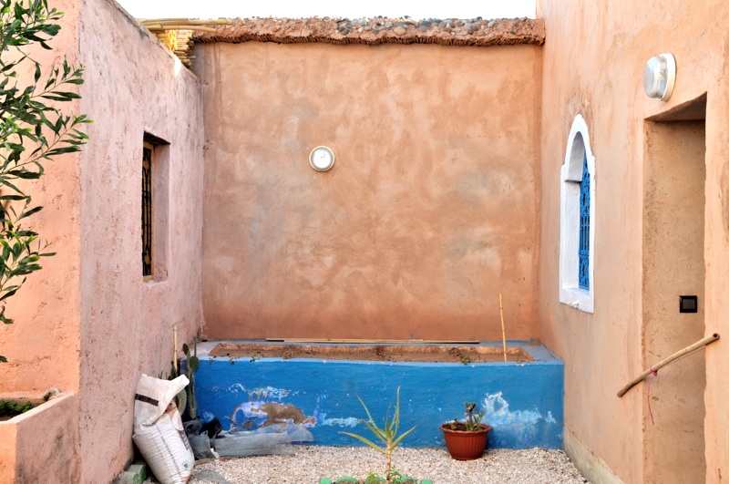 Le seul endroit disponible est au fond du jardin où elle sera enclavée entre 3 murs (image ci dessous), orientée plein sud elle sera balayée par le soleil de 9h30 à 15h 30mn, ouverte à la lumière par le plafond et un seul côté.