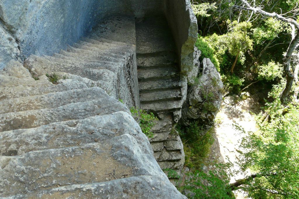 Une partie du chemin d'accès , un escalier a été taillé en longues marches pour faciliter le pas des ânes :