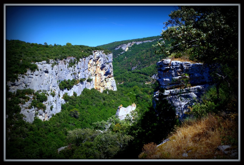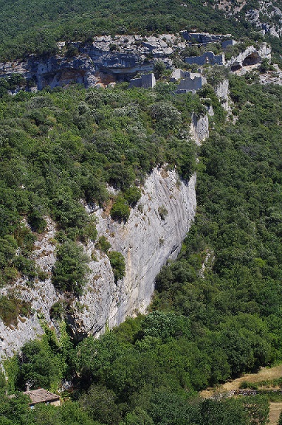 On commence par le principal , à l'entrée de la combe y a la piaule ou j'habite . En bas à gauche de la photo on distingue vaguement un toit , c'est là . On voit uniquement le toit mais vous faites pas de bille pour moi en dessous il y a des murs des portes et des fenêtres . Voici une autre photo : sans ma piaule c'est tout de suite moins intéressant pas vrai ? Toutefois entre les falaises , en dessous des arbres , subsiste une piste (encore praticable en 4x4 ) qui est une des plus ancienne voie pour franchir le Luberon depuis la Vallée de la Durance et envahir la ville d'Apt .Vers le XIIe siècle deux forts ont étés construits ainsi qu'une série de postes de garde pour tenailler la combe et ses environs : le fort de la Roche ,aujourd'hui disparu et difficilement repérable et le fort de Buoux qui lui est encore visible .
