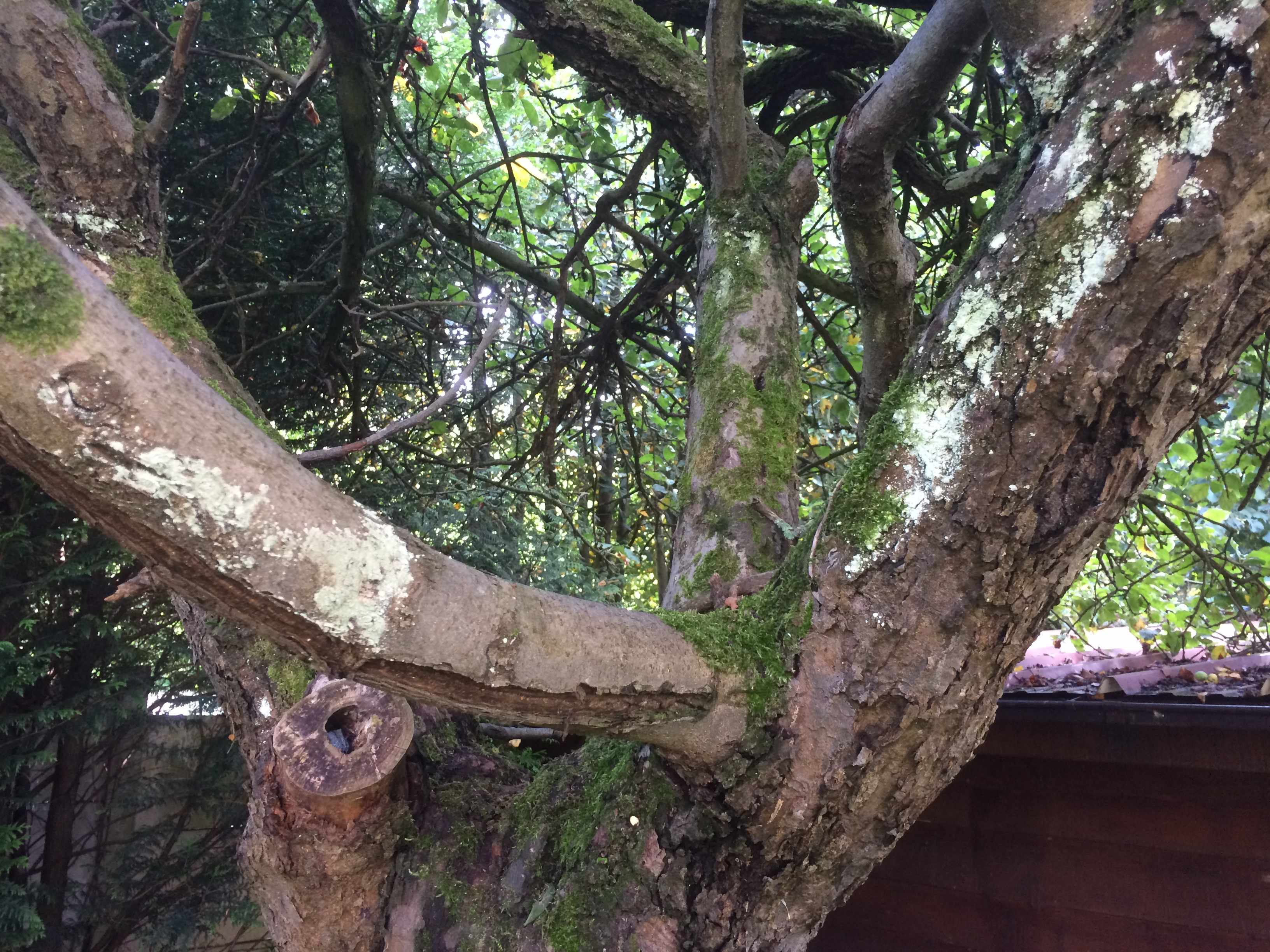 Il est juste à côté d'un très vieux pommier non entretenu qui a aussi des taches blanches.