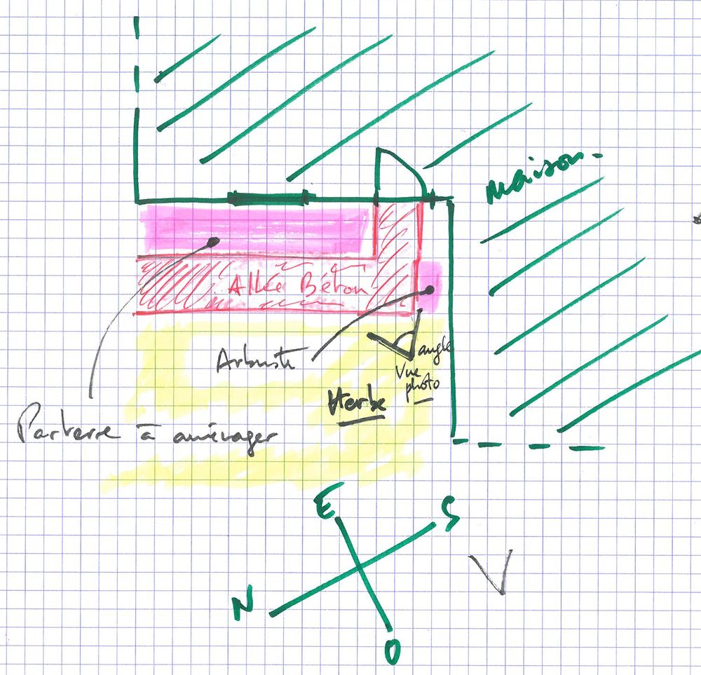 L'idée est d'enlever l'herbe et de l'aménager avec des galets puis des plantes de faibles hauteurs adaptées à l'ombre et au climat normand.