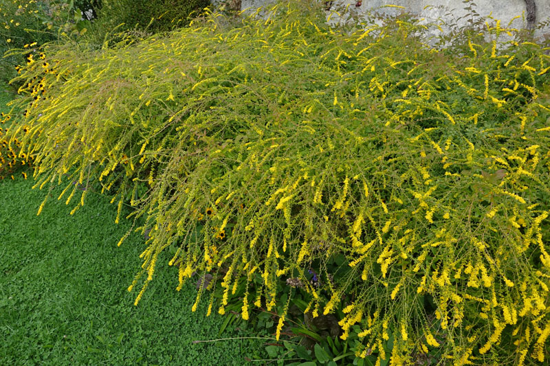 Je n'arrive pas à identifier cette plante au port retombant. Hauteur de 70 cm. Elle produit des tiges de fleurs très petites jaunes. Un côté "arbre à papillon" en miniature. Fleurit en ce moment.